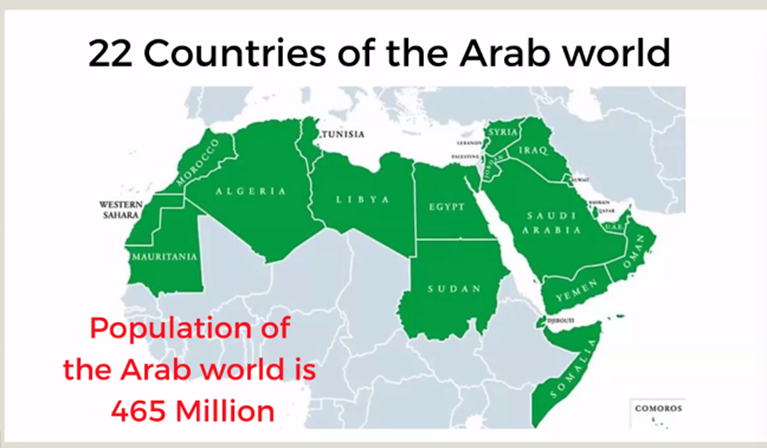 Finally, Moushabeck’s map of countries where Arabs live erases Israel, which is 20 percent Arab, and claims the disputed West Bank territories as “Palestine.” She also distorts the Jewish presence in the Arab world: